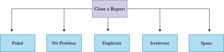 To close a report: 1) Go to the bottom of the report above the comment box. 2) Select Close report in the action picker. 3) Choose the status of the report which reasoned to the close report. 4) Click Close report button.